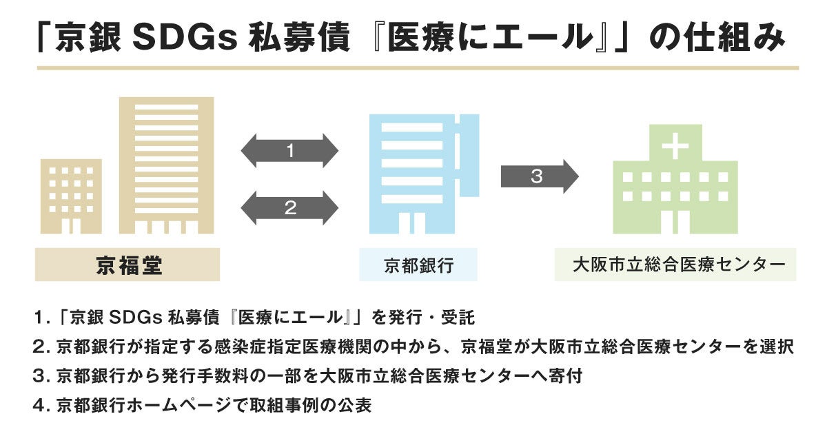 『関わる人全てに「豊かさ」を届け「夢」にあふれる未来を提供し続ける』株式会社 京福堂(本社:大阪府大阪市、代表取締役社長:関 崇樹)は、当社が発行したSDGs私募債を株式会社 京都銀行(本社:京都府京都市、取締役頭取:土井 伸宏)に引受いただき、本件にかかる発行手数料の一部を、当社が指定する地域の感染症指定医療機関の大阪市立総合医療センターへ寄付したことをご報告いたします。