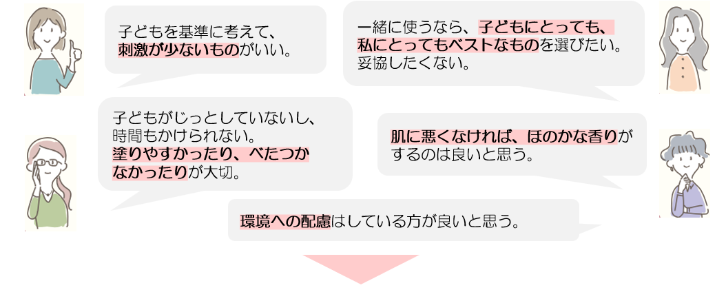 毎日忙しく過ごすママが手軽に使えるように。子どもと一緒に使いやすい容器や使い心地、使い切るまでの期間などを考えた商品を提供します。