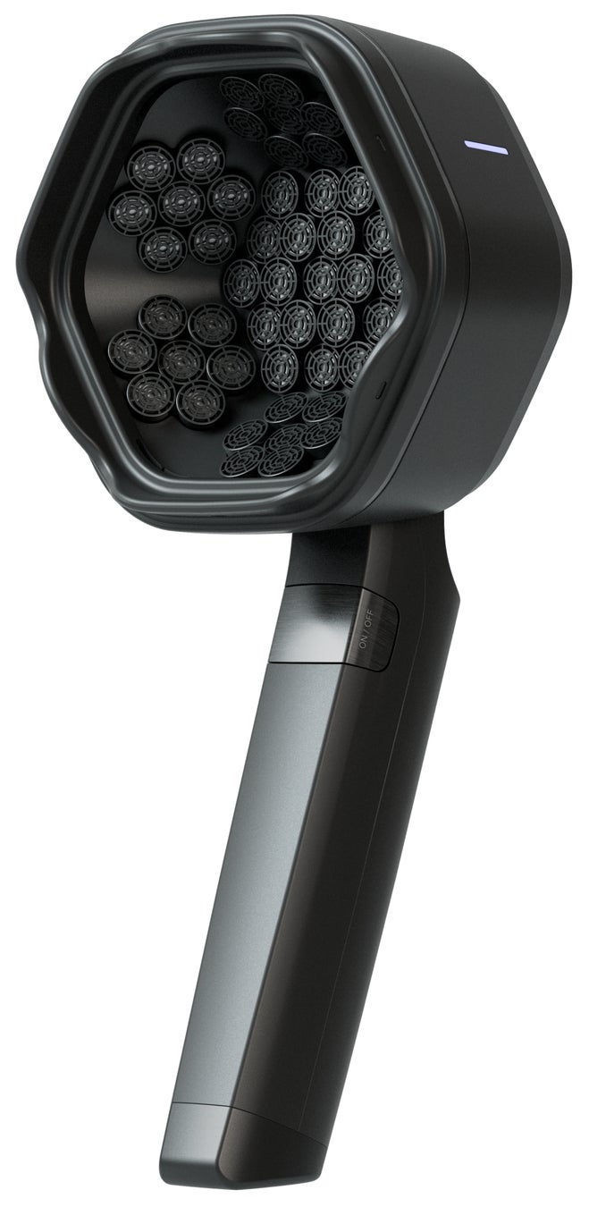 独自開発の技術「非接触振動圧刺激」は、空中を伝わる超音波を利用して非接触で皮膚を刺激する技術です。独自のヘキサゴン構造によって、デバイスに搭載された61個の超音波スピーカーが発する超音波を集束させ、効率的に頭皮を刺激します。