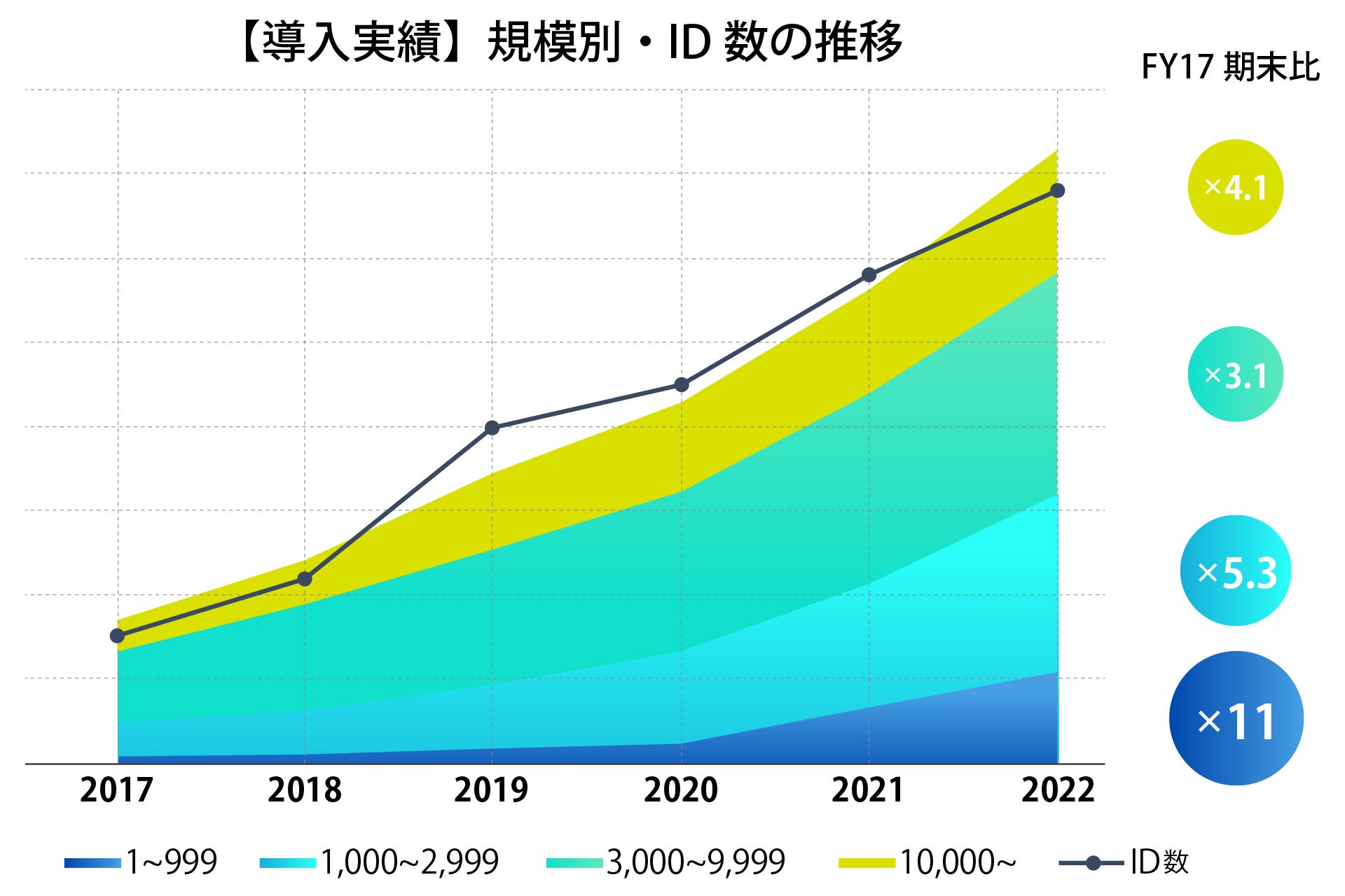 また、プロダクトブランドの刷新とともに、新たに、中堅・中小企業向けプロダクトを「Growbase」シリーズに追加リリースいたします。従来のHSSが保有する機能のうち、組織別・従業員別の健康情報等の可視化や集計機能の他、労基報告書作成やストレスチェック等の法令対応機能等に絞り、従業員の健康管理に対して専任スタッフによる体制を持たない企業でも、よりシンプルで簡単に操作ができるUI/UXを重視したプロダクトとしており(*2)、下図の通り、2020年以降、急速に従業員規模で1~999人以下の導入企業数拡大を背景に、市場投入を決定いたしました。