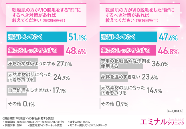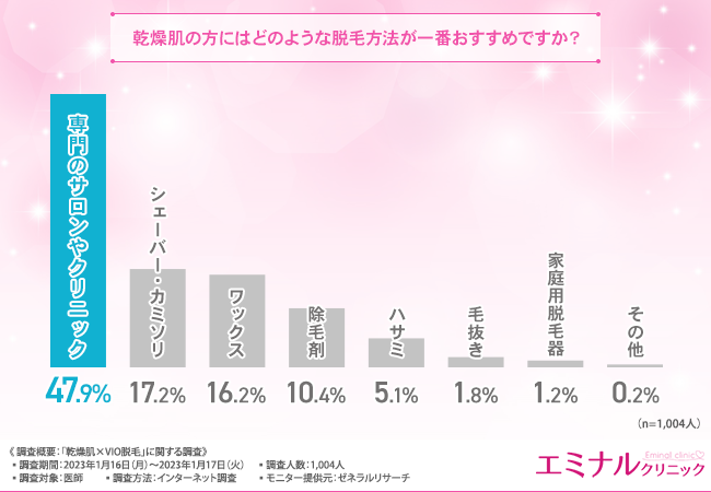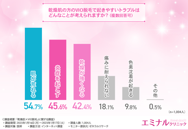 そこで今回、医療脱毛のエミナルクリニック(https://eminal-clinic.jp/lp01/?refmedia=11073)は、全国の医師を対象に、「乾燥肌×VIO脱毛」に関する調査を実施しました。