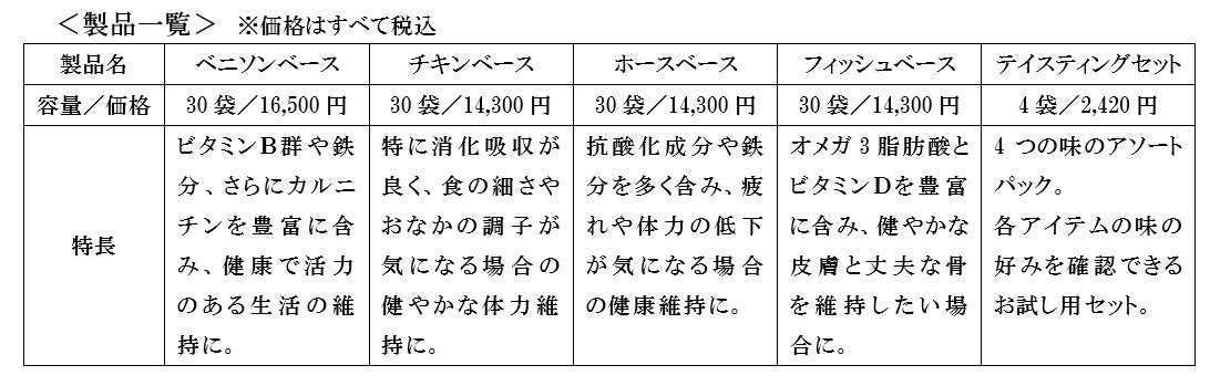 開発者である当社従業員の愛犬が突然のアレルギー反応により健康を害し、治療と再発が続いたことから、健康維持の原点になる食事に着目して改善策を模索しました。しかし、愛犬の健康維持に適したドッグフードが市場に存在していなかったため、自身で製品開発に取り組み、同製品は誕生しました。犬の食性に合わせて良質なたんぱく質を豊富に含むベニソン(鹿)、チキン(鶏)、ホース(馬)、フィッシュ(魚)の4つの肉をベースにした味を用意し、消化のしやすさに着目して良質な原材料の栄養素をそのまま体に届けるフリーズドライ製法を採用しています。いつまでも元気な愛犬と、家族として過ごせるようにという想いを込めたドッグフードです。