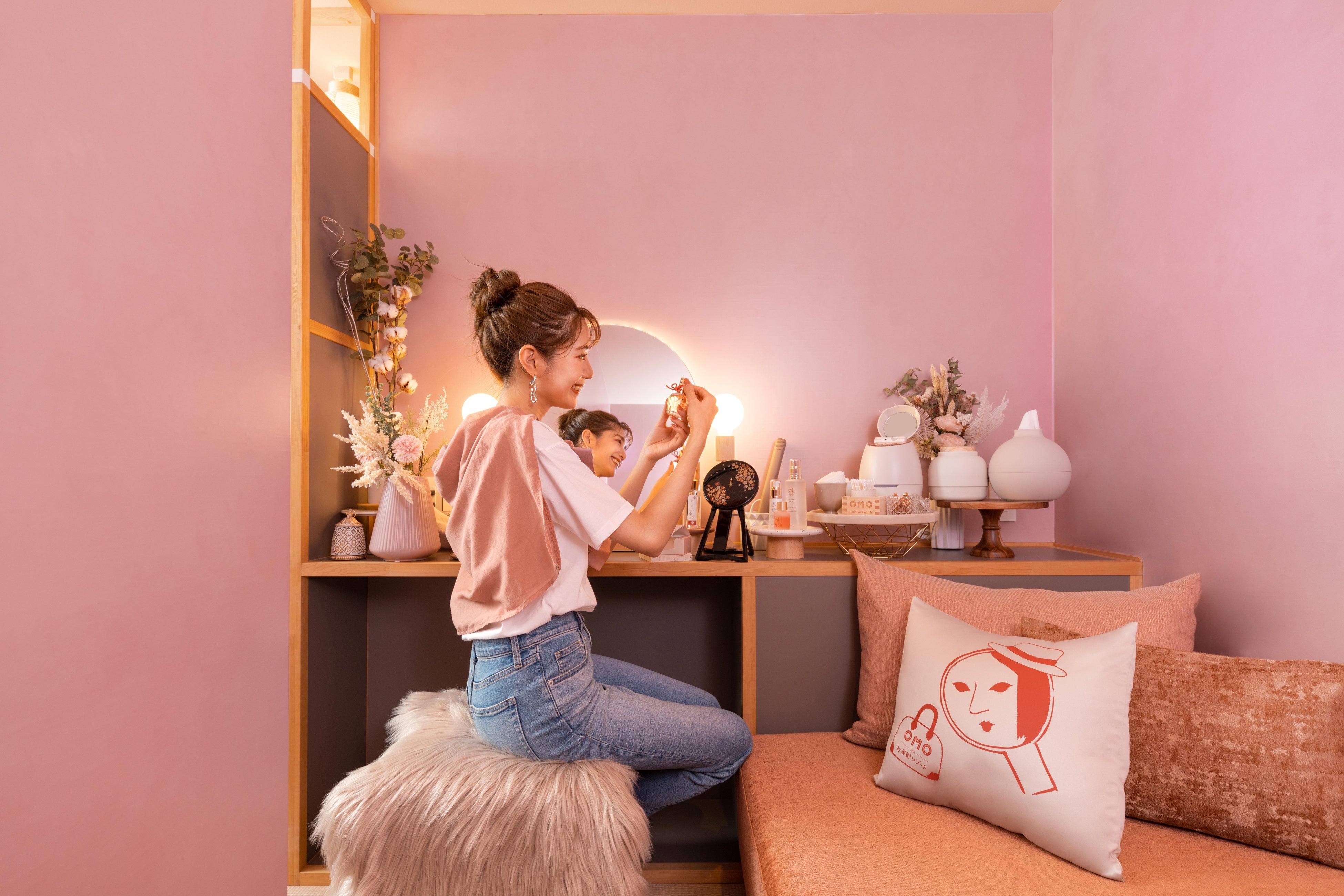 「OMO(おも)5京都祇園」×「よーじや」のコラボルームの中で化粧水やシャンプーなど数多くのよーじや肌ケアアイテムを使って身だしなみを整えたり、テンションあがるレトロかわいいスイーツをお楽しみいただけます。