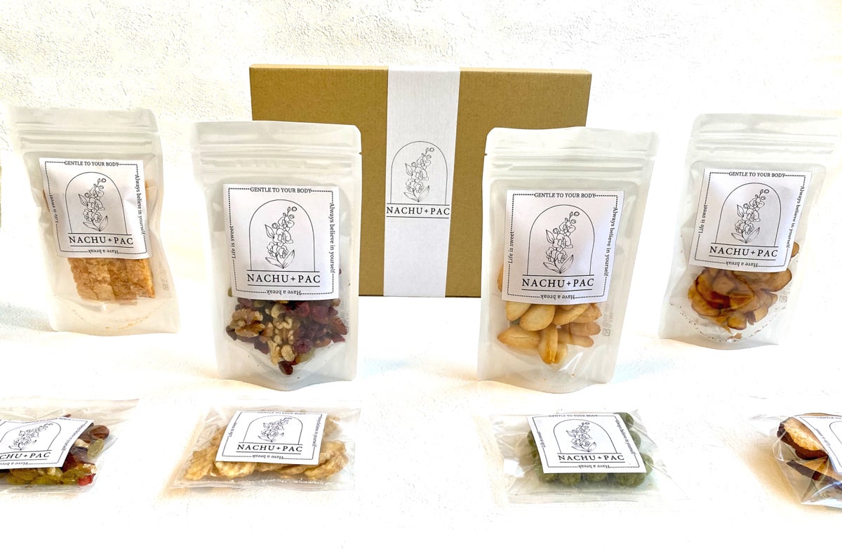 『NACHUPAC』は、月に一度健康に配慮したこだわりのナチュラルおやつを詰め合わせてお届けする、月額制のサブスクリプションサービスです。
