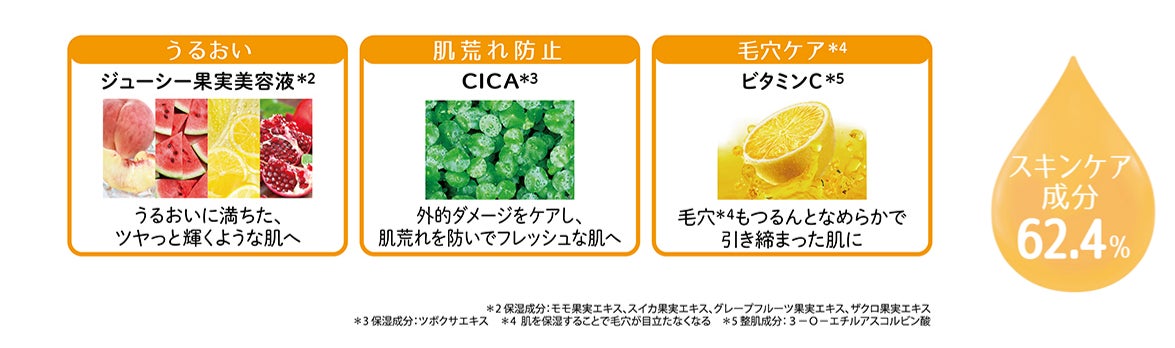 スキンケアオイルとともに美容液成分を溶かし込みました。全成分の62.4%がスキンケア成分。塗るたびにじゅわっと溶け出し、肌を守りながらストレスフリーなつけ心地を叶えます。