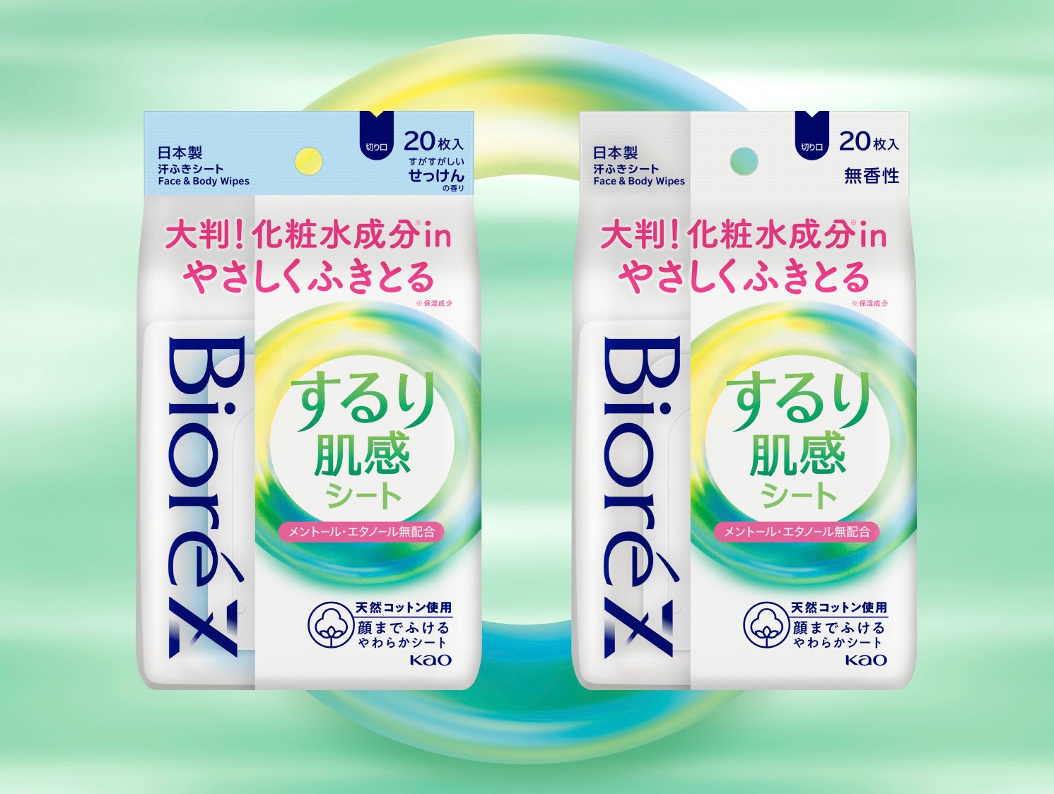 そこで『ビオレZ』は、メントール・エタノール無配合のボディシート「するり肌感シート」を新発売。化粧水成分(保湿)配合で、液をたっぷり含んだ大判シートです。乾燥が気になる季節にも使いやすく、1枚で全身やさしくふきとれます。