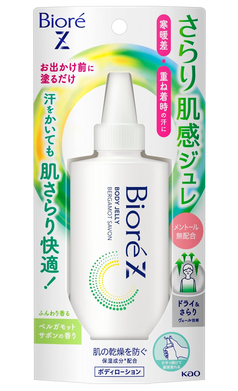 また同シリーズから、お出かけ前に肌に塗っておくだけで、寒暖差や重ね着などで汗をかいても、ずーっとさらっとドライな状態で過ごせる『ビオレZ さらり肌感ジュレ』も数量限定で同日より発売。汗をかいて不快に感じる部位に直接塗っておくだけで、ドライ&さらりヴェール技術により汗を乾かし続け、肌をずっとさらっとドライに保ちます。