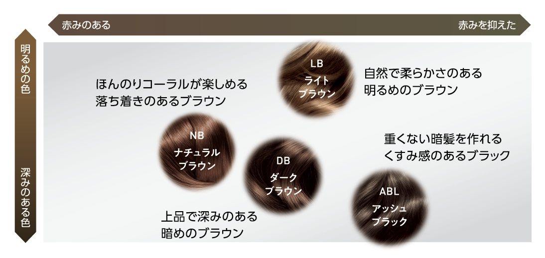 白髪染め初心者でも使いやすいトリートメントタイプ。一回目での白髪の染まりの良さを目指し、長年の研究結果をもとに、多種類の染料をバランスよく配合。髪一本一本を包み込んで、濃厚でリッチに染め上げます。