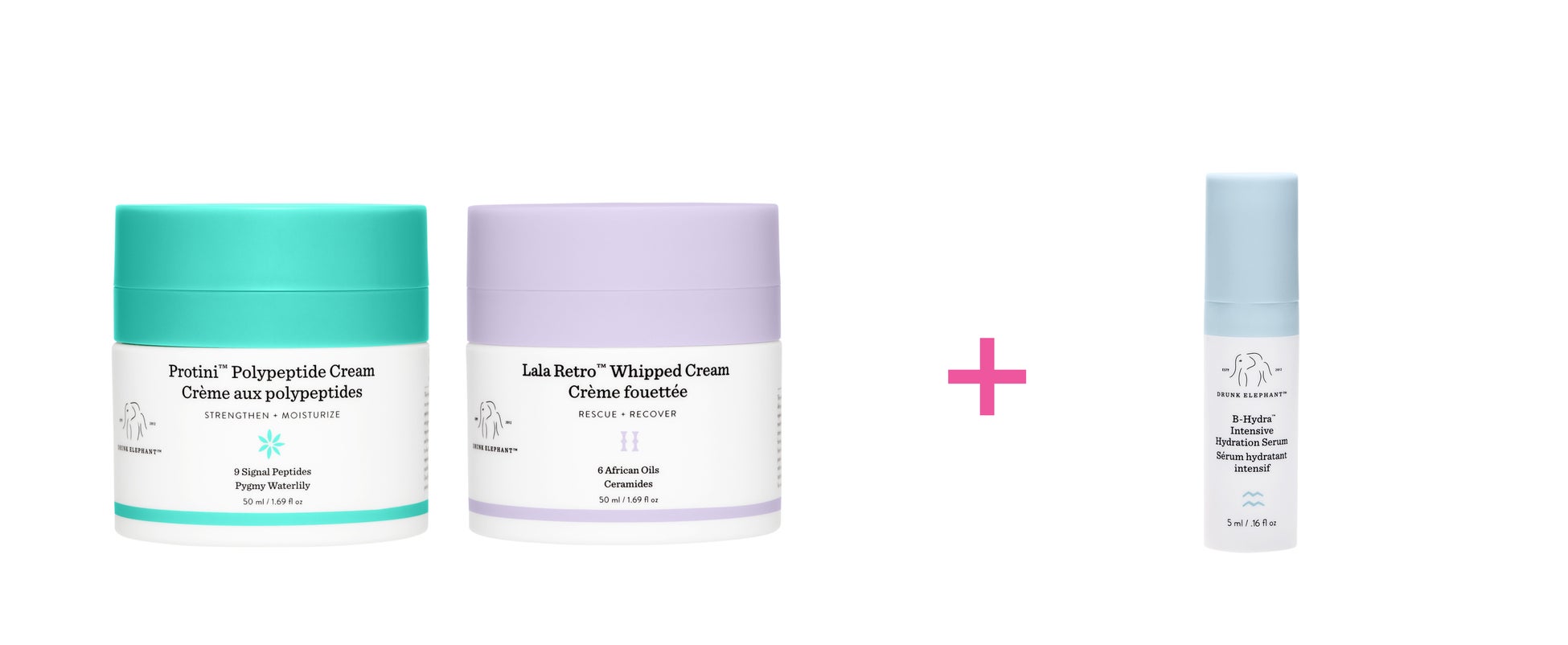 人気の「プロティニ ポリペプチド クリーム」もしくは「ララレトロ ホイップクリーム」のいずれか1点購入すると、「ビーハイドラ インテンシブ ハイドレーションセラム(特製サイズ)」をプレゼント。これらのアイテムだけでドランク エレファントの新感覚・スキンケア方法 手のひらスムージー も手軽にトライできます。