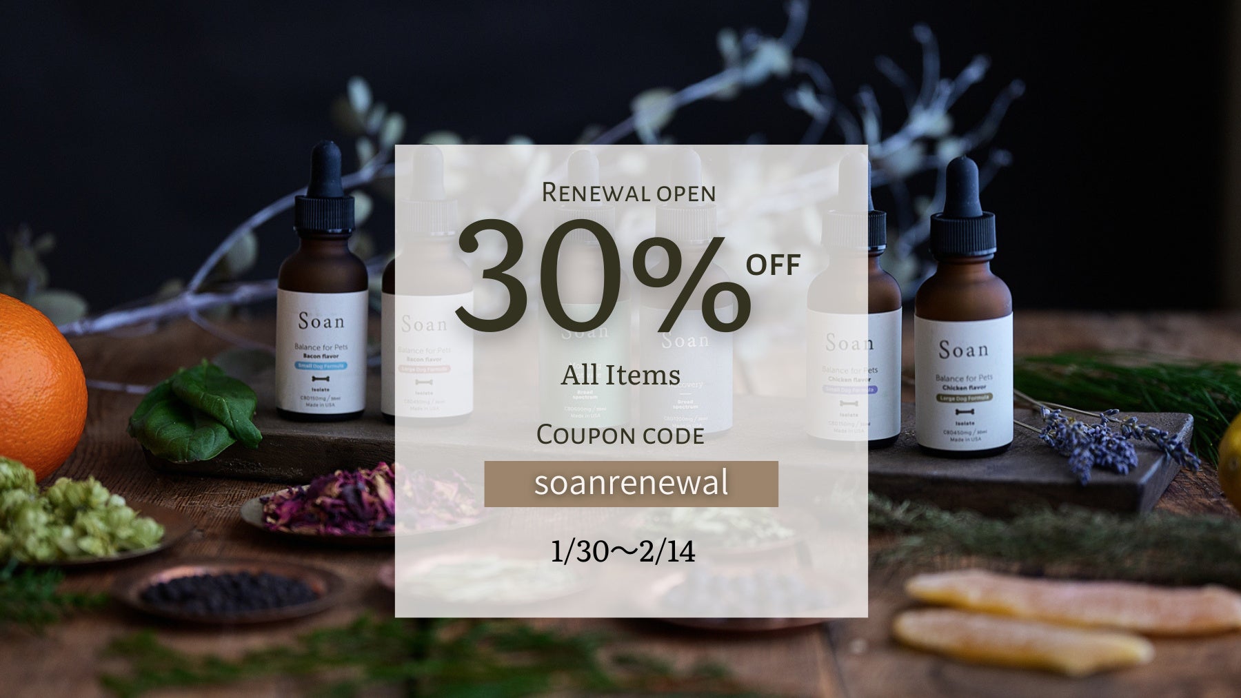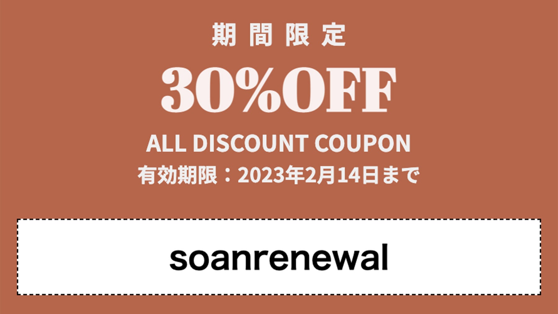 こだわりぬいた原材料でつくられたCBD製品を販売する株式会社SOAN(本社:東京都世田谷区玉川3-20-2、代表取締役:高橋政樹)は、1月30日(月)~2月14日(火)Soan 新発売商品も含めた全商品を30%OFFで販売いたします。