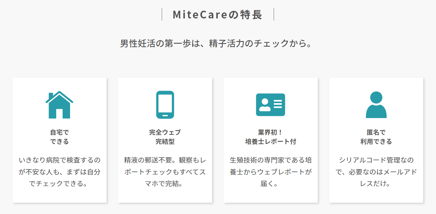 MiteCare(ミテケア)は、不妊の不安に向き合うカップルをサポートするための精子チェッカーで、男性妊活の第一歩をサポートするホームキット及びオンラインサービスです。