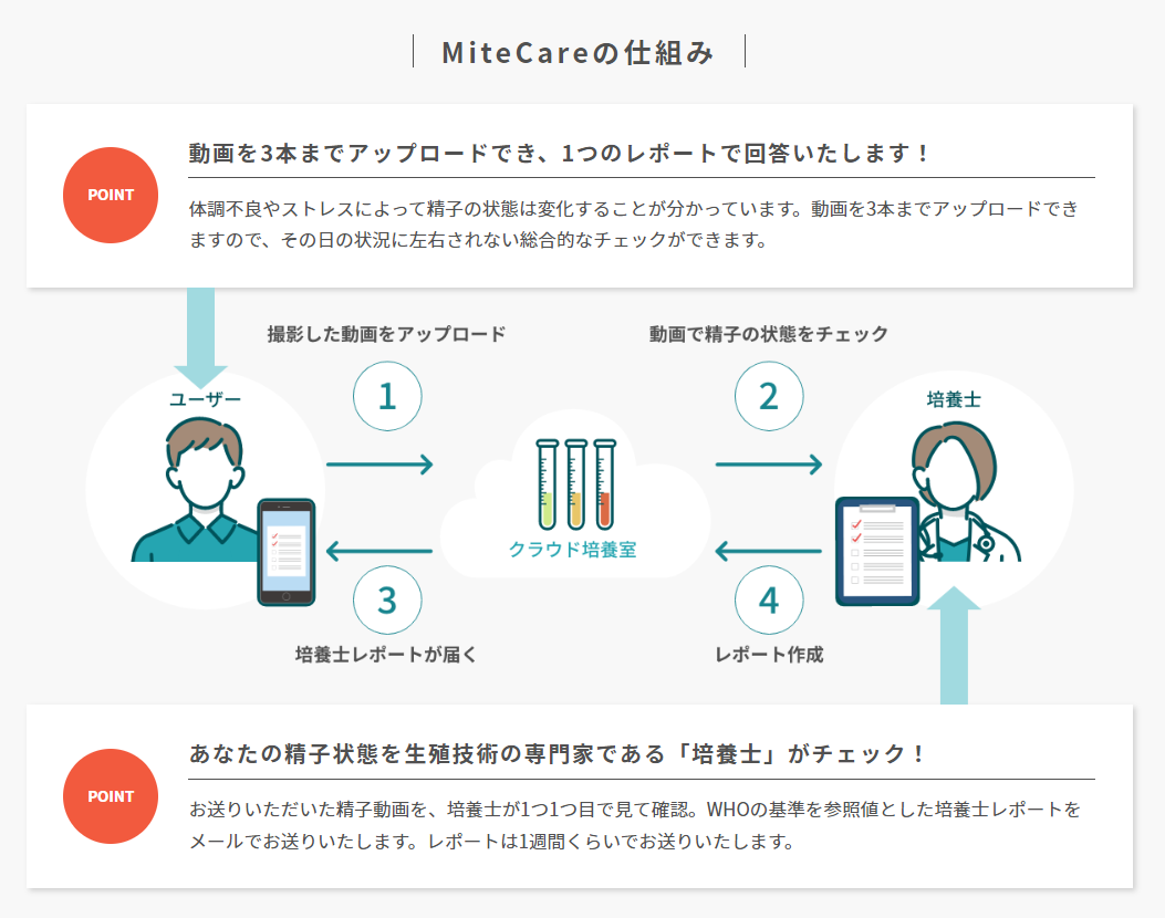 MiteCare(ミテケア)は、専用レンズをスマートフォンに取り付けることで、自身の精子状態を自宅で簡単に動画撮影することができ、専用サイトからその動画ファイルを認定培養士に匿名で送ることができます。認定培養士はWHOの基準値を参照値として、撮影された動画ファイルの精子の状態についてのレポートを送付し、不妊に悩んでいる男性やカップルが妊活を進める為の第一歩を踏み出しやすくさせることで、早期の不妊治療を促すことにつながります。