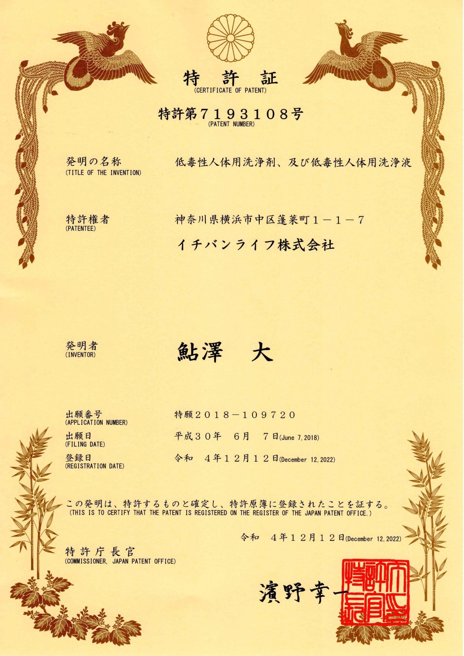 健康長寿の研究成果を事業化するスタートアップ「イチバンライフ株式会社」(本社:横浜市、代表:鮎澤 大 横浜市立大学名誉教授)は、このたび低毒性シャンプーの特許を取得いたしました。