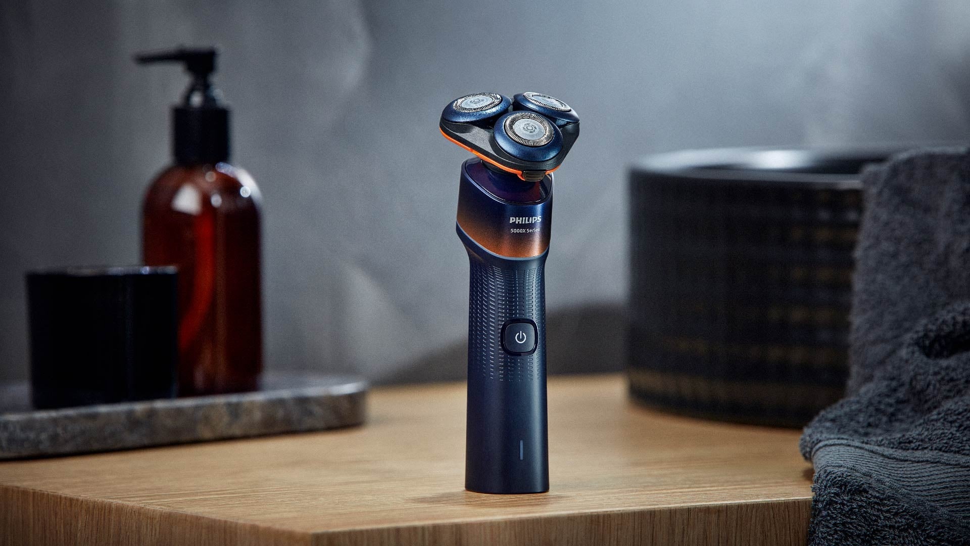 若者世代に最も多かった「肌へのやさしさ」ニーズに応えるために、これまで上位機種にのみ搭載されていた「マイクロビーズコーティング」を初めて「5000Xシリーズ」に搭載しました。これにより摩擦による肌への負担を非コーティング素材と比較して20%も低減させ、さらに低アレルギー性サージカルステンレス刃[6]を使用することで肌への刺激を低減しています。またパワフルな27枚刃が毎分55,000回ヒゲをカットし、360度可動するヘッドが顔の輪郭や凹凸に密着することで剃り残しが少なく、早剃りと深剃りまでも実現しています。デザインについても一新させ、フィリップス初のシェーバーが自立するデザインを採用しました。スタンドが不要なので一人暮らしのコンパクトな洗面所でも置く場所を選びません。