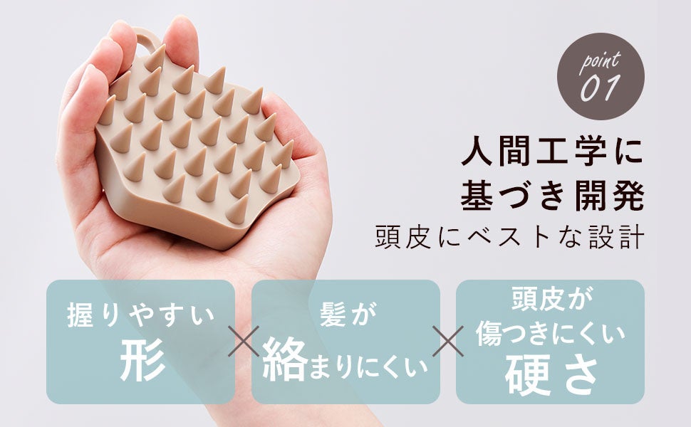 手に収まりやすいサイズ感と、髪が長い方でも絡まりにくい突起の配置を研究しました。