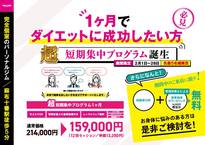 麻布十番駅徒歩5分のパーソナルジム「33GYM」が2月月間申込&先着5組様限定で特別プログラムをご用意。完全個室の贅沢な空間で、1ヶ月間12回のトレーニングと管理栄養士による徹底した食事指導、その他にも、手ぶらでOK(ウエア等レンタル)・トレーニング前の脂肪燃焼サプリ・トレーニング後のプロテイン・シャワー利用等、結果を短期間で出す為の準備を整え全力でお手伝いします!