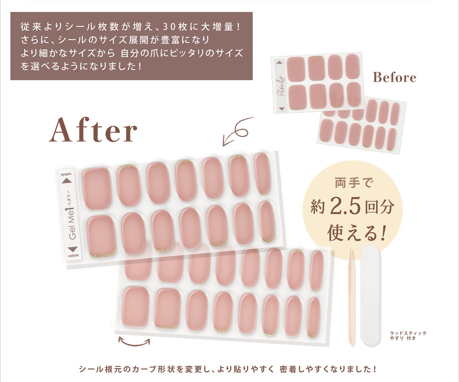 お客様のご要望にお応えしてシールの枚数を大増量!両手約2.5回分ご使用いただける30枚仕様となり、たっぷり使いやすいシートになりました。