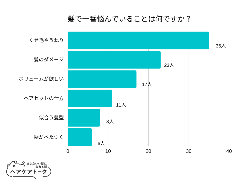 「髪で一番悩んでいることは何ですか?」とアンケート調査した結果、1位は『くせ毛やうねり』でした。