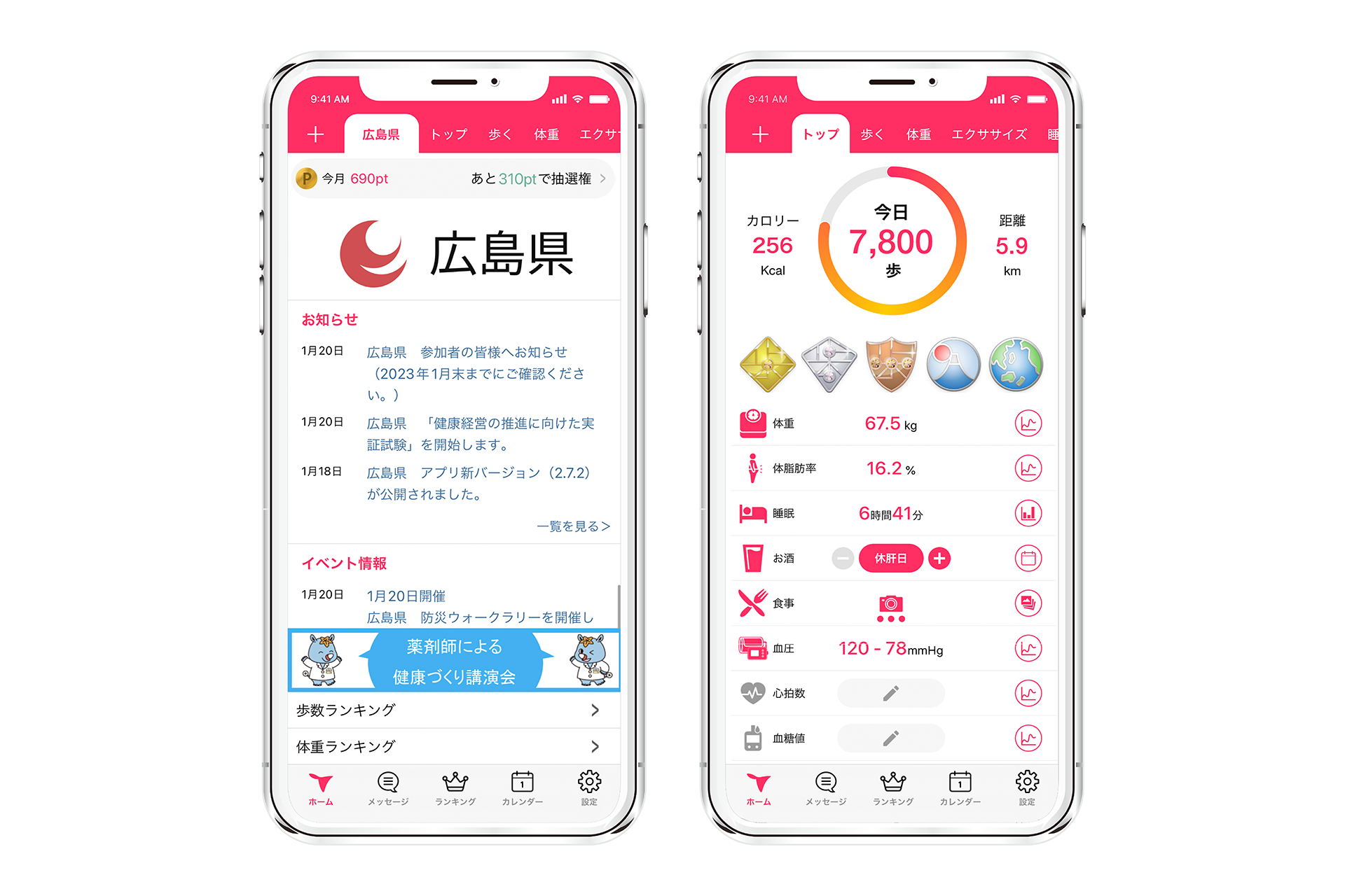 ・歩数計測や体重記録、体温記録やラジオ体操動画の視聴など、16以上の健康管理機能