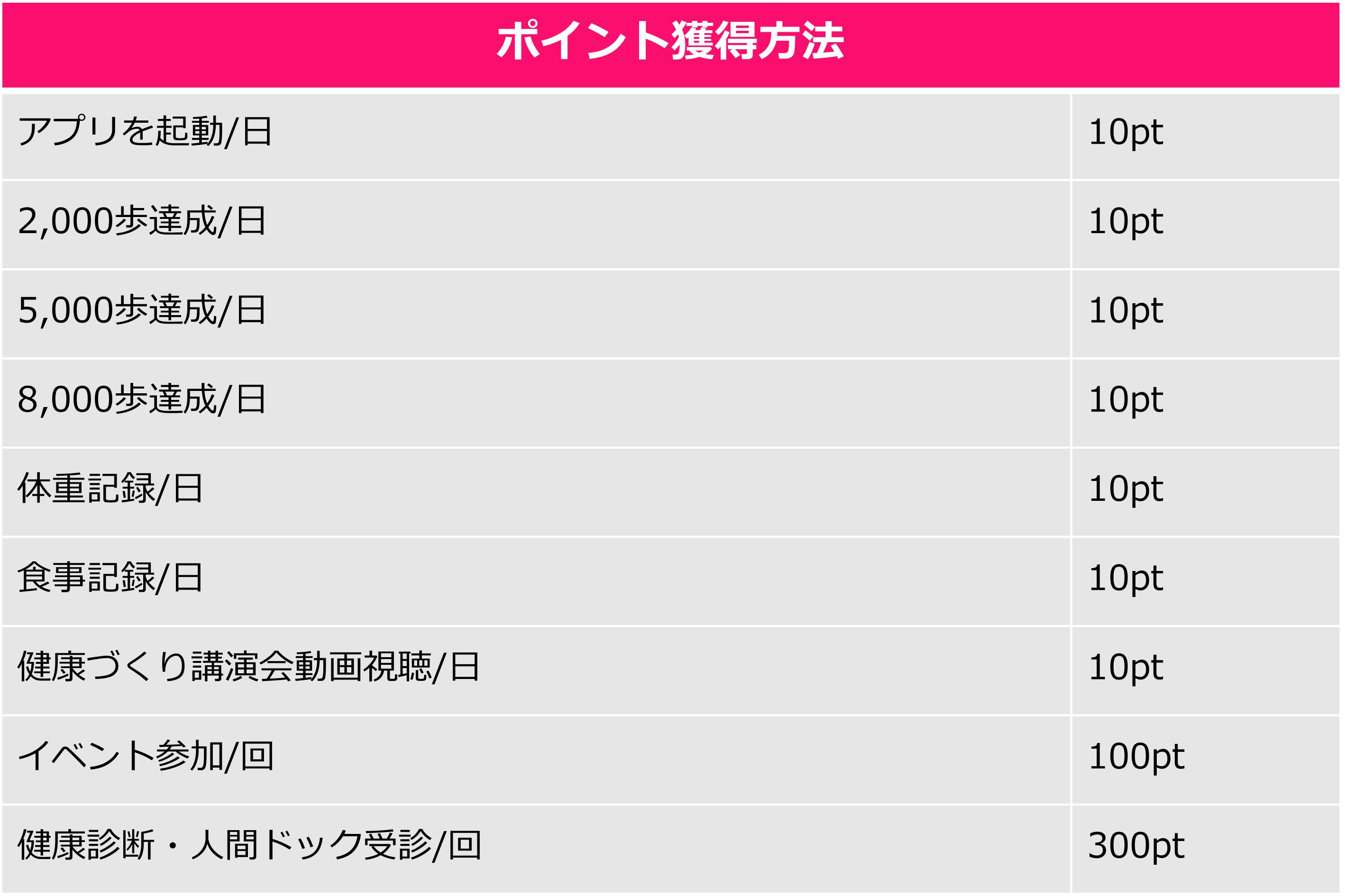 ・一定歩数の達成や体重記録などの健康活動でポイントを付与