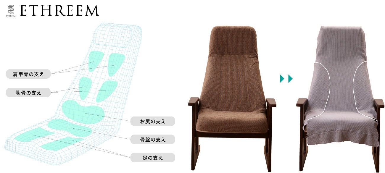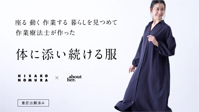 アパレルショップではきれいに見えたのに、試着して確認したのに、実際に生活してみると肩周り腕周りが窮屈だったり突っ張って動きにくかったり、着崩れしやすかったり、首元が詰まってきたり、という不快感は、今までの服飾パターンが「動く体を前提に作られていなかった」ということに気づき、体に添う椅子作りのノウハウから動きにくさのストレスを解消する独自のパターンを導きました(意匠登録出願済み)。同じ箕面市にある複合型アパレルショップabout her.(マツオインターナショナル株式会社)とのコラボレーションで、 デザイン性の高い商品として完成しました。