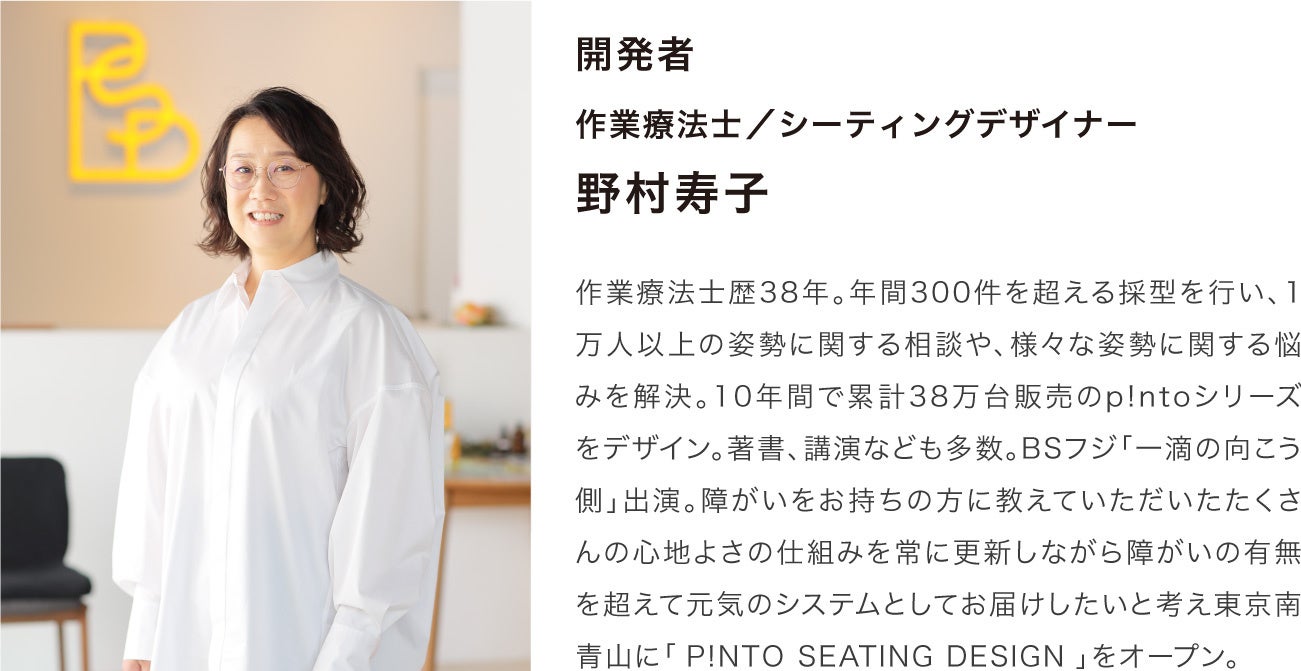 株式会社ピーエーエス(本社:大阪)は20年前より、障がいがある方のオーダーメイド車椅子を製作してきました。国内特許取得の独自の採型方法で、呼吸や関節・筋肉、人の動きを研究し快適性と機能性を兼ね備えたオーダーシートを作り続けてきました。 これまでに1万人を超える姿勢の悩みを解決してきたノウハウから生まれた一般向け商品「p!ntoシリーズ」は累計38万台を突破。 2018年自社ブランド店舗「P!NTO SEATING DESIGN」を東京南青山に出店。 2019年ドイツジャーマンデザインアワード受賞。 BSフジ「一滴の向こう側」など多くのメディアでも紹介されました。