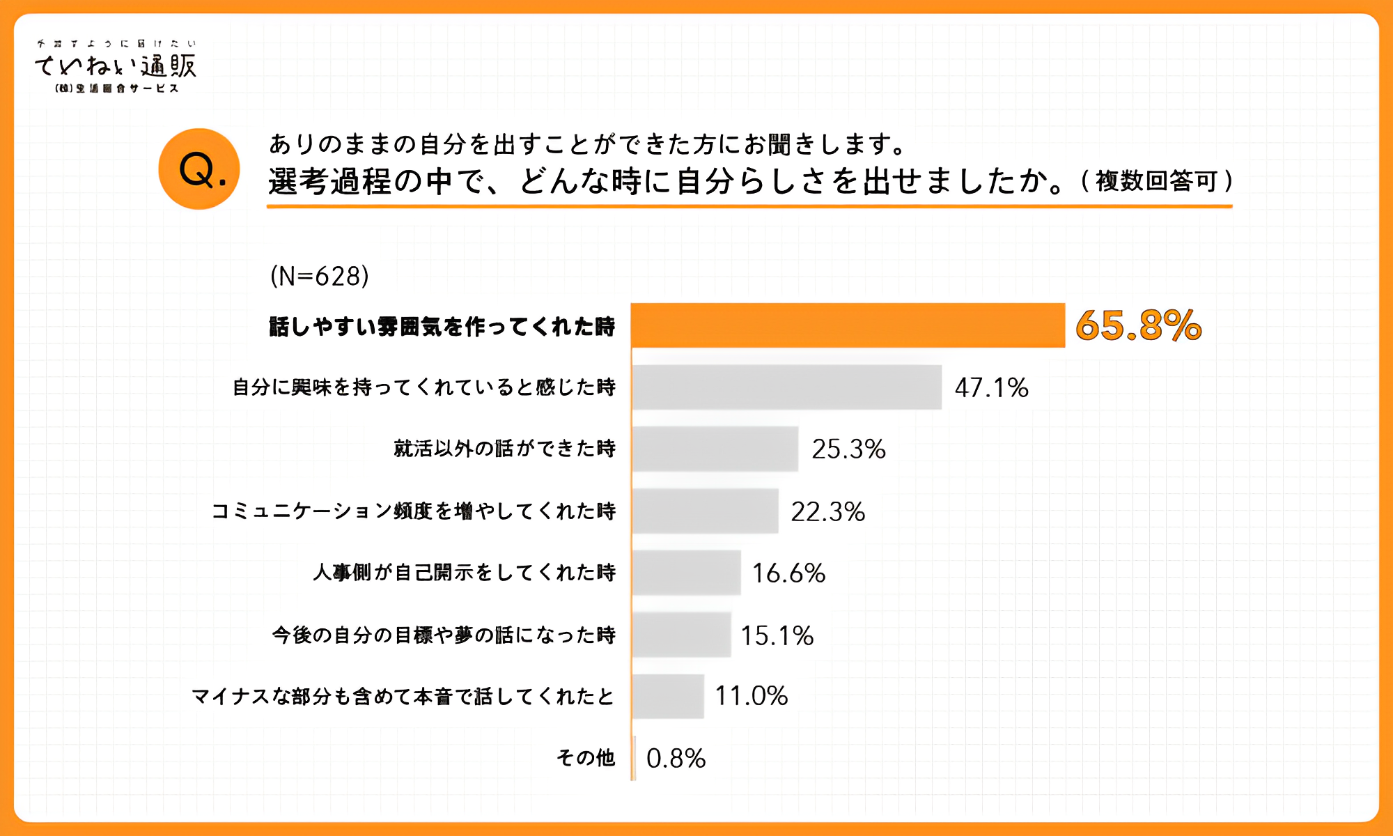 採用選考を受けた際に「ありのままの自分を出すことができた」と回答した人のうち、自分らしさを出せたのは「話しやすい雰囲気を作ってくれた時」と回答した人が65.8%でした。次いで、「自分に興味を持ってくれていると感じた時」が47.1%と、3番目に多い「就活以外の話ができた時」から20ポイント以上多い結果となりました。