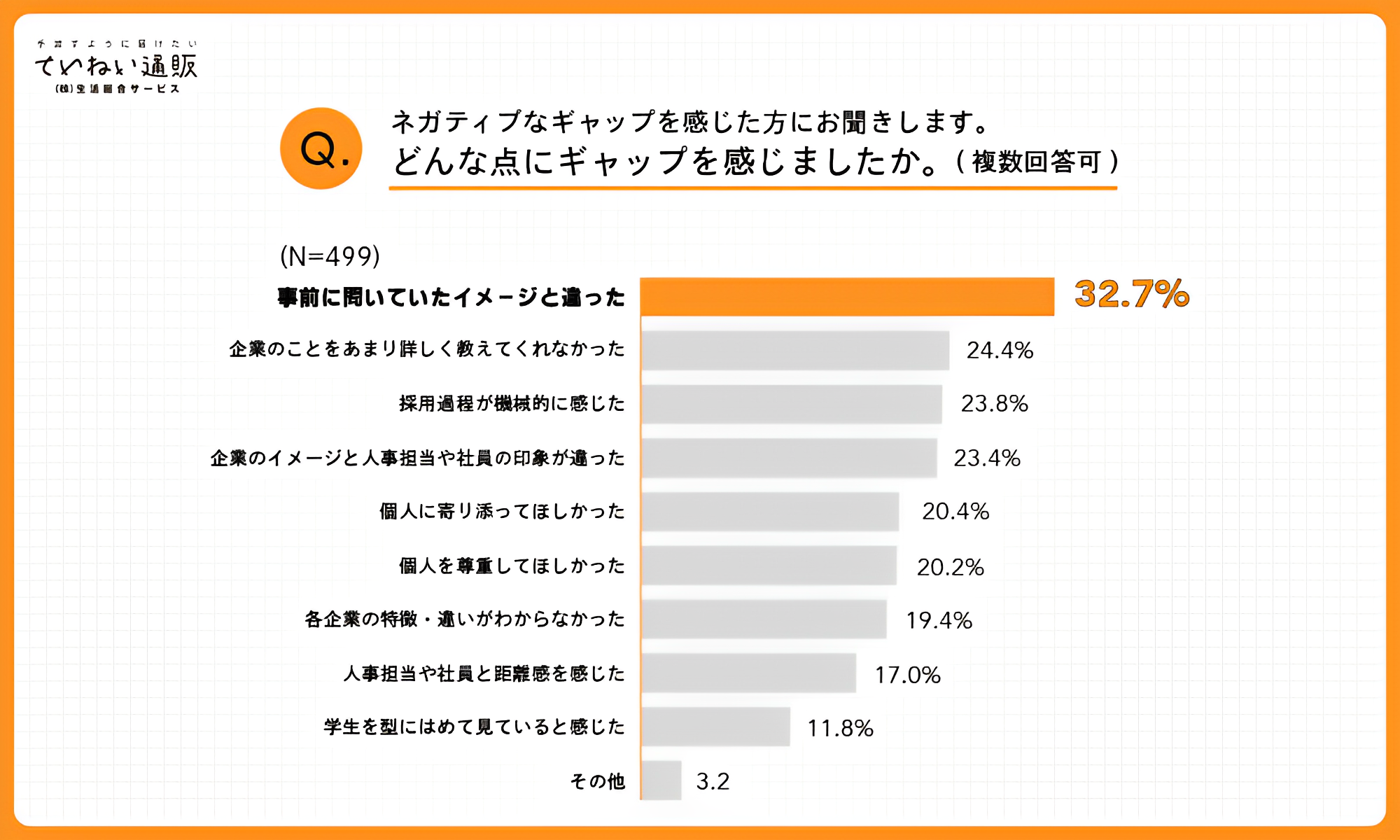 ギャップを感じた内容について、「事前に聞いていたイメージと違った」と回答した人が32.7%と最も多い結果となりました。次いで約4人に1人が「企業のことをあまり詳しく教えてくれなかった」、「採用過程が機械的に感じた」、「企業のイメージと人事担当や社員の印象が違った」などと感じていることが分かりました。