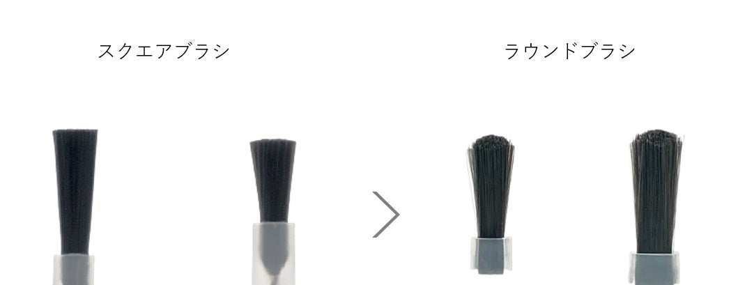 スクエア型マニキュアブラシは、爪の根元の角をきれいに塗るには少し工夫が必要でしたが、ラウンド型は真っ直ぐにストロークするだけで、より簡単キレイに塗ることができます。またサイズもS・Mと変わらず選ぶことができますので、お客様のお爪の大きさにあったブラシでストレスフリーに塗ることができます。
