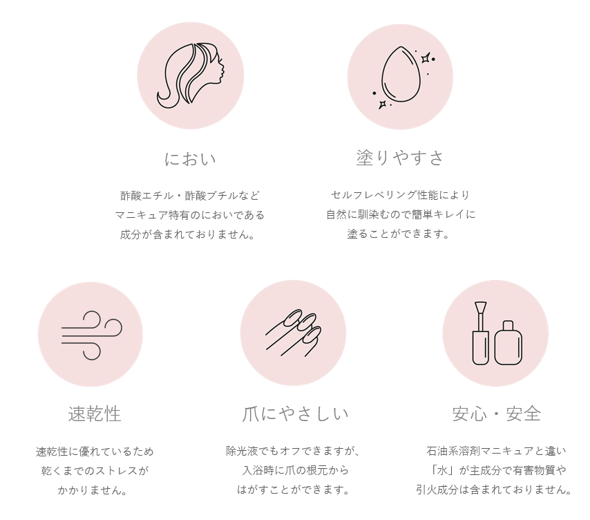 主に流通する石油溶剤ネイルポリッシュ(マニキュア)と違ってシンナー臭がなく化学成分も少ないので、爪はもちろん妊婦の方や小さいお子さま、ペットにも優しく安心してご使用できます。