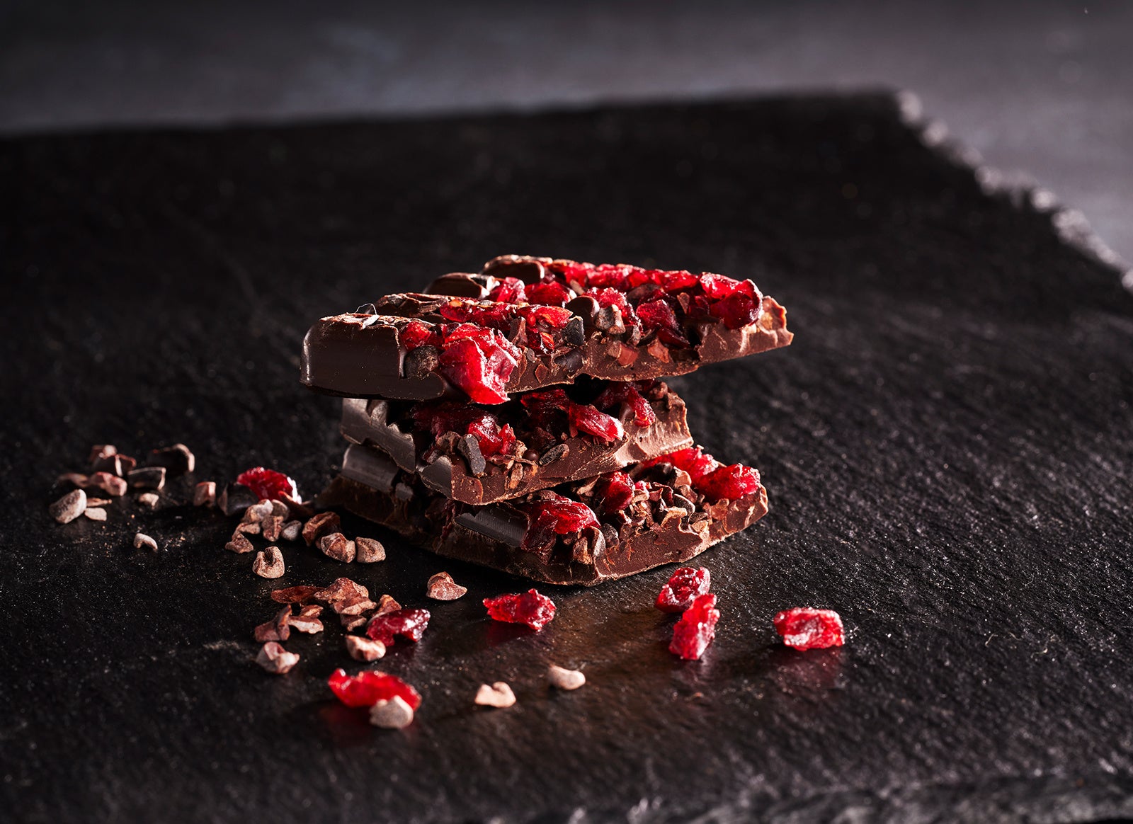 ダークチョコレート(ドイツ産)(カカオマス、砂糖、ココアバター、その他)、ドライクランベリー、カカオニブ