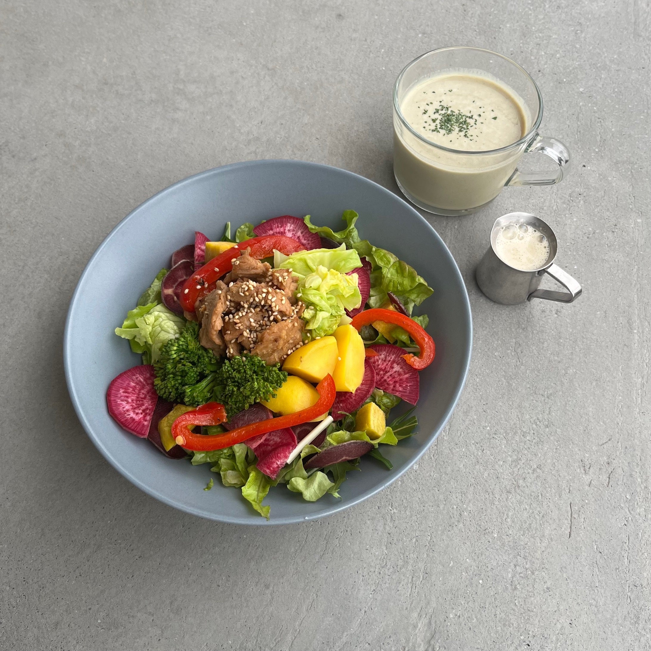スチームや生、ローストにしたお野菜で、食感も楽しく、和風胡麻ドレッシングでクリーミーに仕上げました。