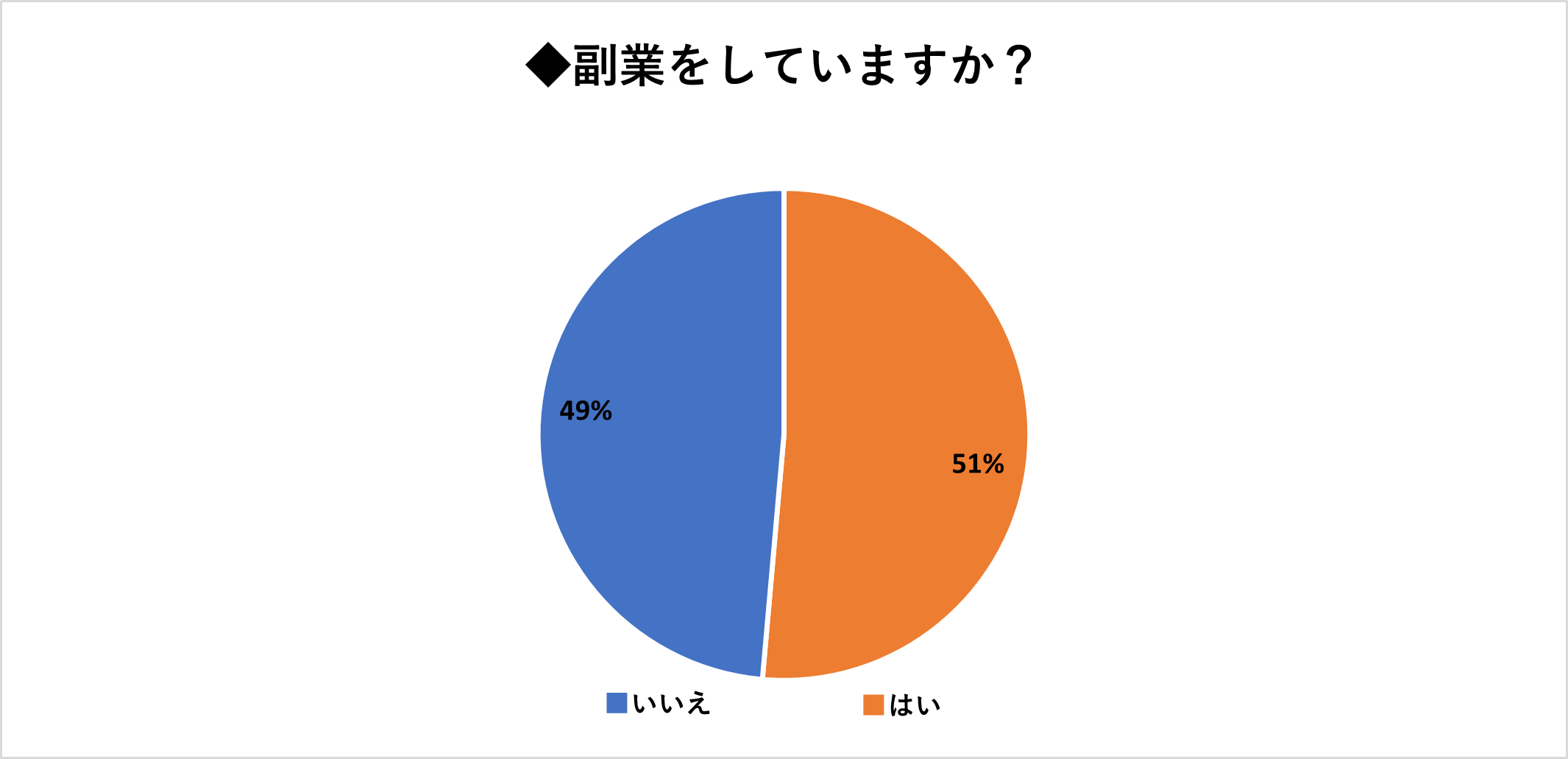 回答は、「はい」が51%、「いいえ」は48%という結果になりました。副業をしている社員が約半分もいるということが分かりました。