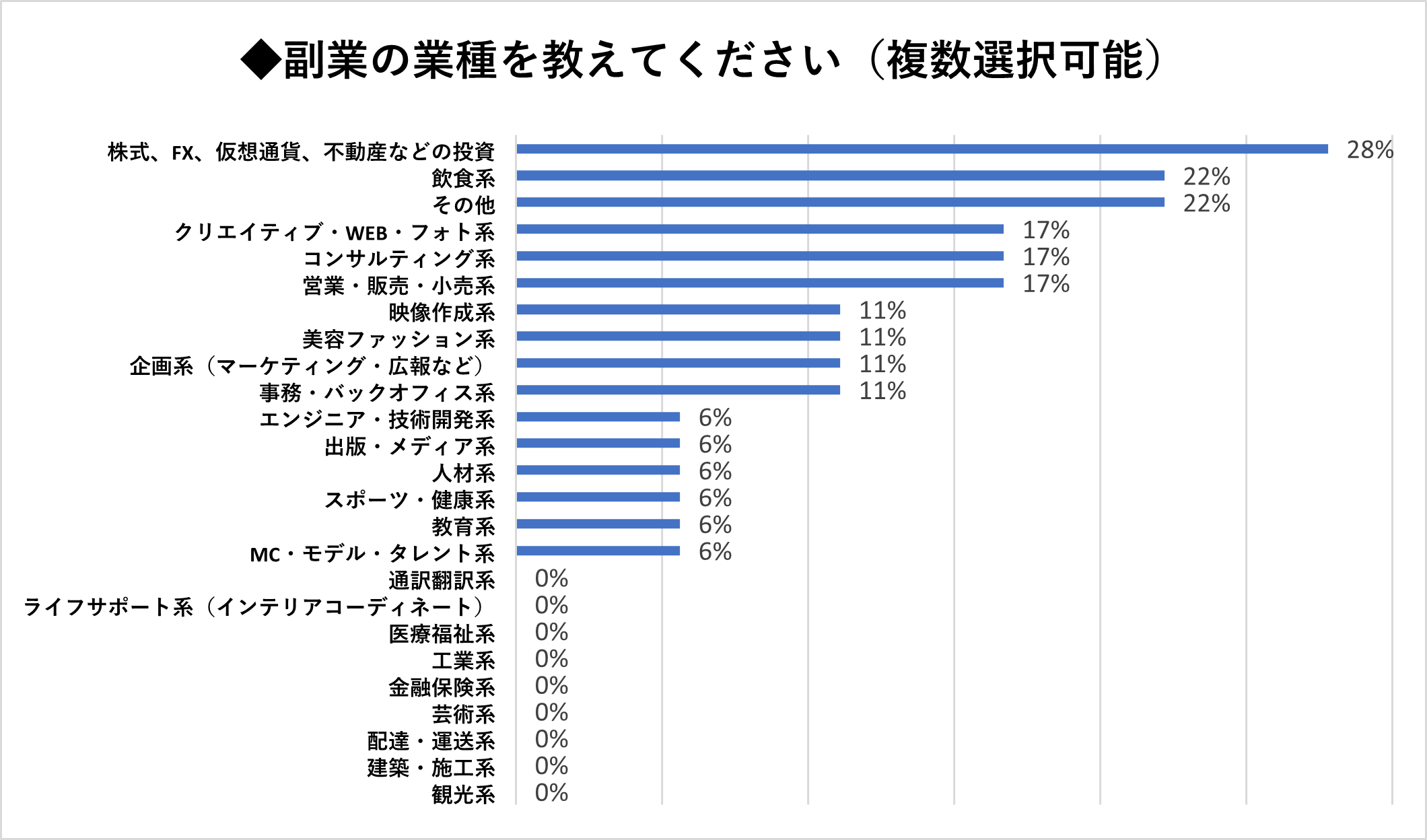 回答は、一番多いのが「株式、FX、仮想通貨、不動産などの投資」、次に多いのが「飲食系」「その他」という結果になりました。業種は様々な答えに分かれました。