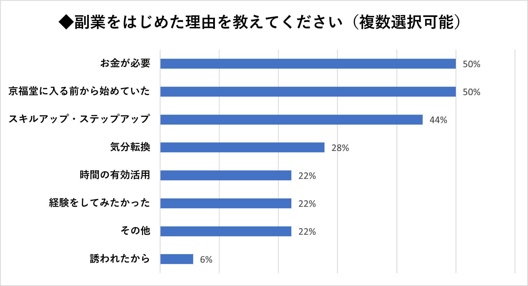 回答は、一番多いのが「お金が必要」「京福堂に入る前から始めていた」、次に多いのが「スキルアップ・ステップアップ」という結果になりました。