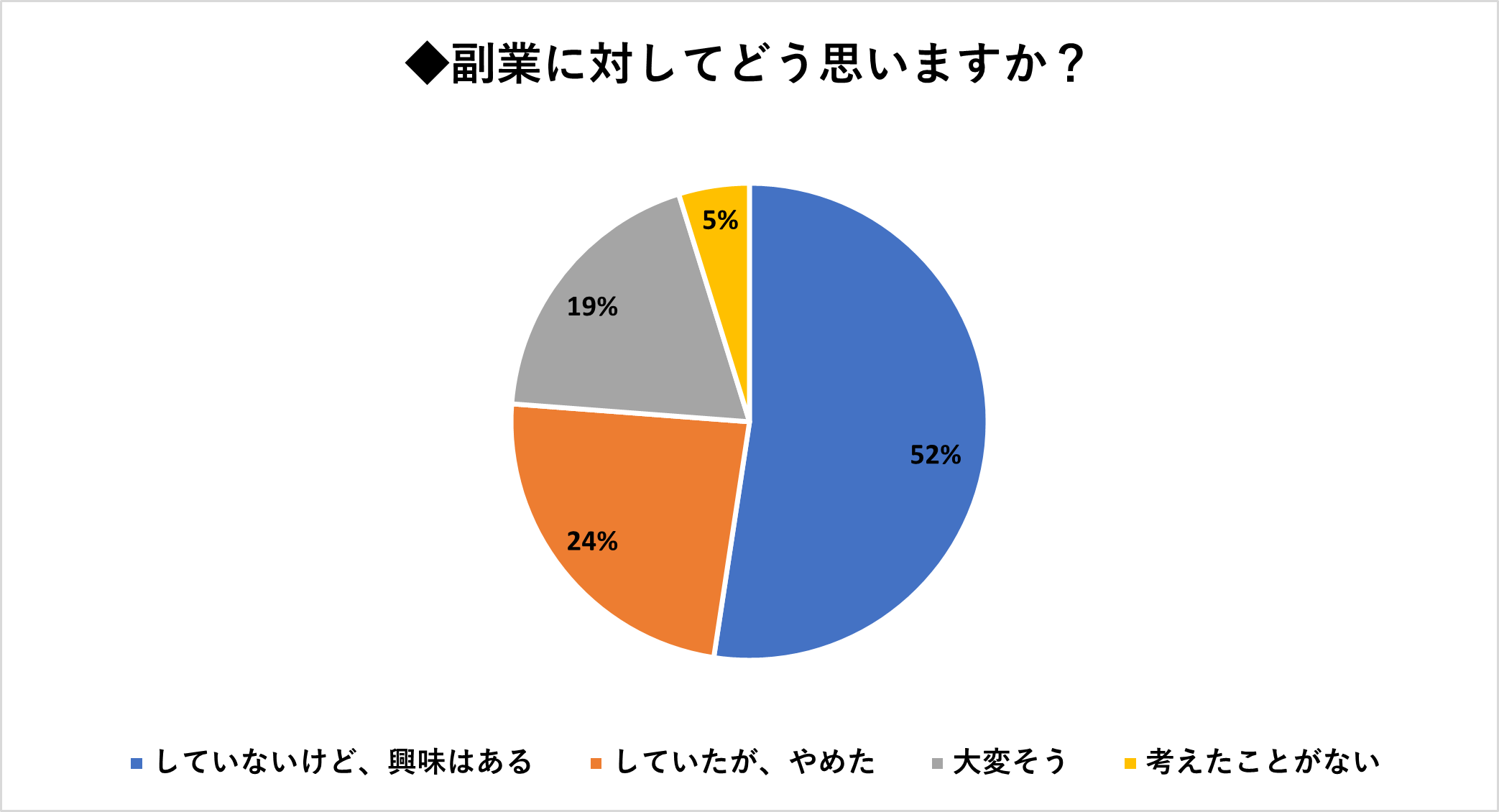 回答は、「していないが、興味はある」が52%、「していたが、やめた」は24%、「大変そう」は19%、「考えたことがない」は5%という結果になりました。一度は副業をした、または考えたことがあるという意見が多いということが分かります。
