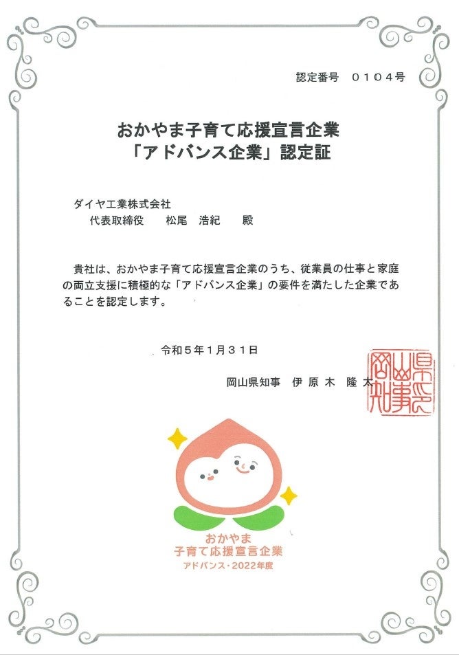 医療用品メーカーのダイヤ工業株式会社(本社:岡山県岡山市 代表取締役:松尾浩紀)は、2023年1月31日(火)に、「おかやま子育て応援宣言企業」の中で、特に従業員の仕事と家庭の両立支援に積極的な企業「アドバンス企業」に認定されました。