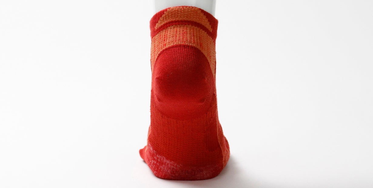 かかと上部にWのテーピング技術を用いて足首をがっちりホールドしてブレを抑え、走りのフォームの安定とケガのリスクを軽減させる機能を付加しています。足と靴下をしっかり密着させ、靴下の脱げることを防ぎます。