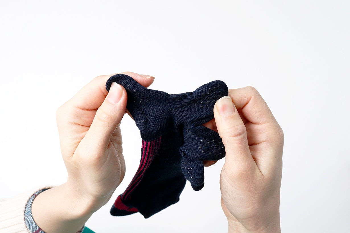 一般的な5本指靴下は、軍手編み(横編み)と呼ばれ、ストレッチがなく生地に余裕がないため指間の摩擦が起きやすく、長距離などを走ると水ぶくれなどのトラブルを引き起こしやすい構造です。本商品は、3D立体編みによって指間の生地にストレッチがあるので、摩擦を引き起こしづらい構造を実現しています。これにより、足と靴下の摩擦によるトラブルの発生などを抑えます。