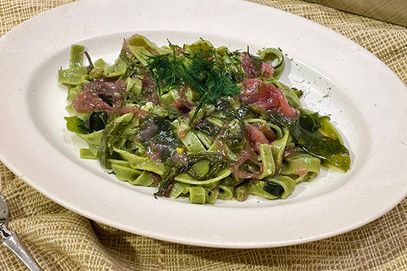 ■メニュー名:海藻のペペロンチーノ (パブロバ藻のフェットチーネ)