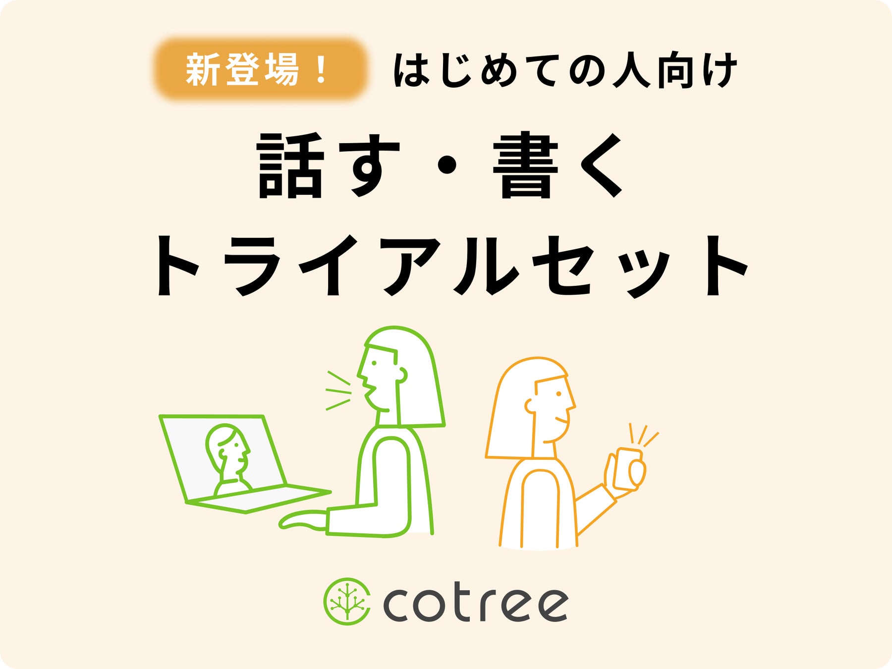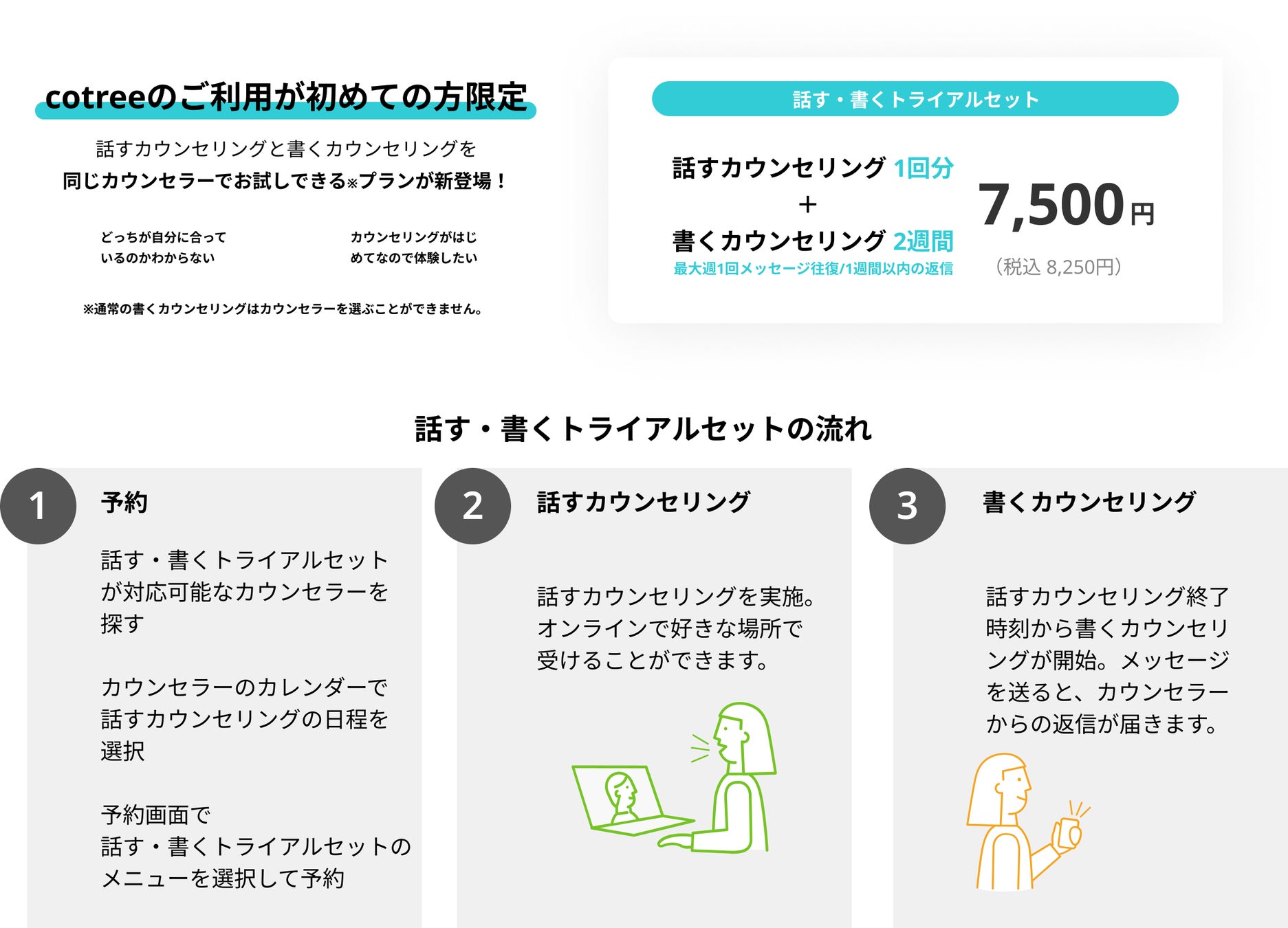 これまでご利用者様から「話すと書く、どちらが自分に合っているか分からない」といったお声をいただくことが度々あり、このたびcotreeのご利用が初めての方限定で2種類のカウンセリングをまとめて体験することができる「話す+書くトライアルセット」をご用意いたしました。