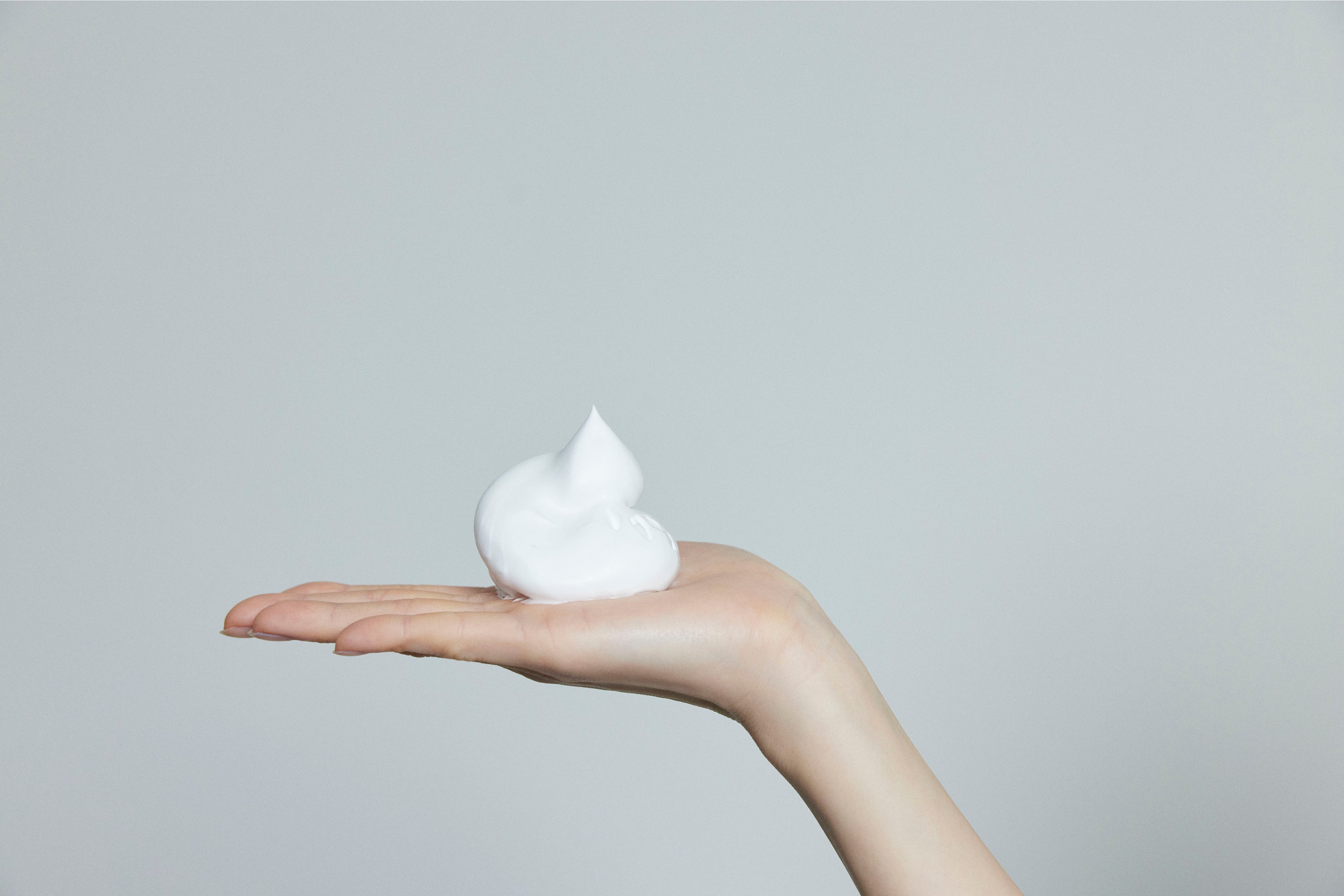 ②洗顔後の清潔な乾いた顔全体に厚めに泡を広げます。