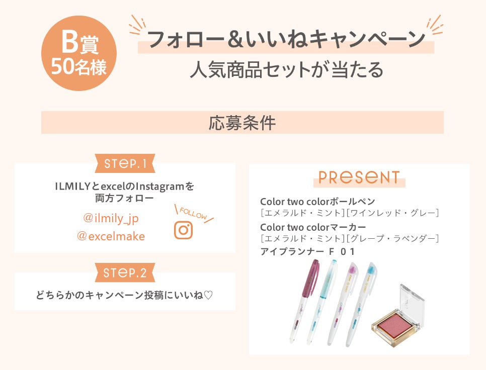 2023年2月7日から4月9日まで、ノエビアグループの常盤薬品工業株式会社(本社:東京都港区)のメイクアップブランド『エクセル』は、株式会社パイロットコーポレーションが展開する文房具ブランド『ILMILY』とのコラボレーションを記念して、投稿キャンペーンとフォロー&いいねキャンペーンを実施いたします。