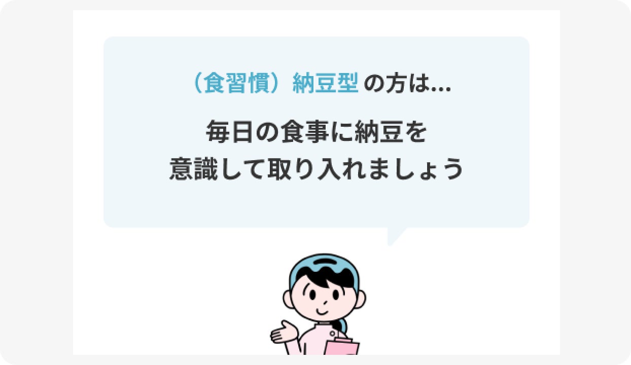 腸内フローラのタイプに応じて、花粉症のセルフケアに活用できる食事や生活習慣のアドバイスを見ることができます。