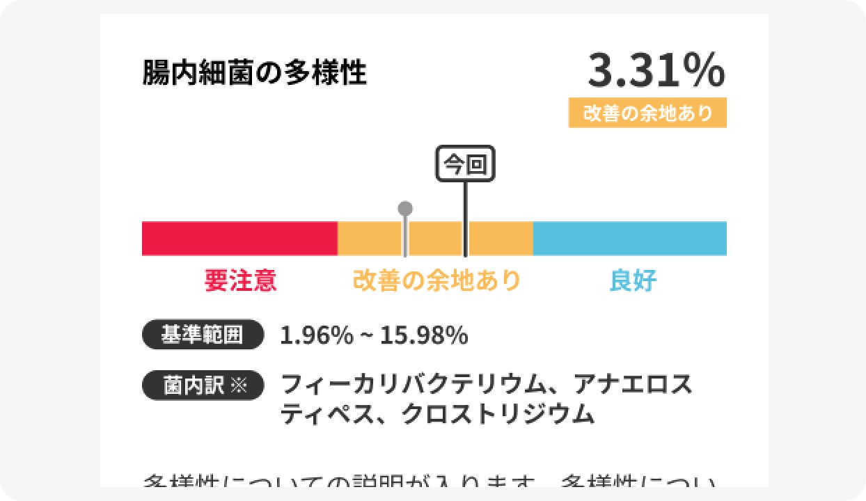 良好な腸内環境の指標となる腸内細菌の多様性が分かります。多様性が高いほど腸内環境が理想的であり、多様性が低いと様々な疾患リスクとの関連があるとされています。