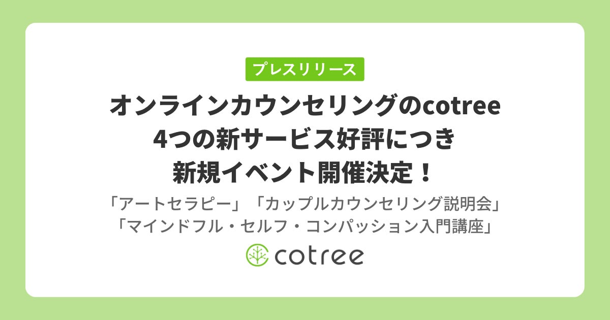 オンラインカウンセリング・コーチングの「cotree」を展開する株式会社cotree(本社:東京都港区、代表取締役:西岡 恵子、以下cotree)は、2022年11月より「グループワークショップ」や「カップルカウンセリング」など4つの新サービスの提供し、好評いただいています。