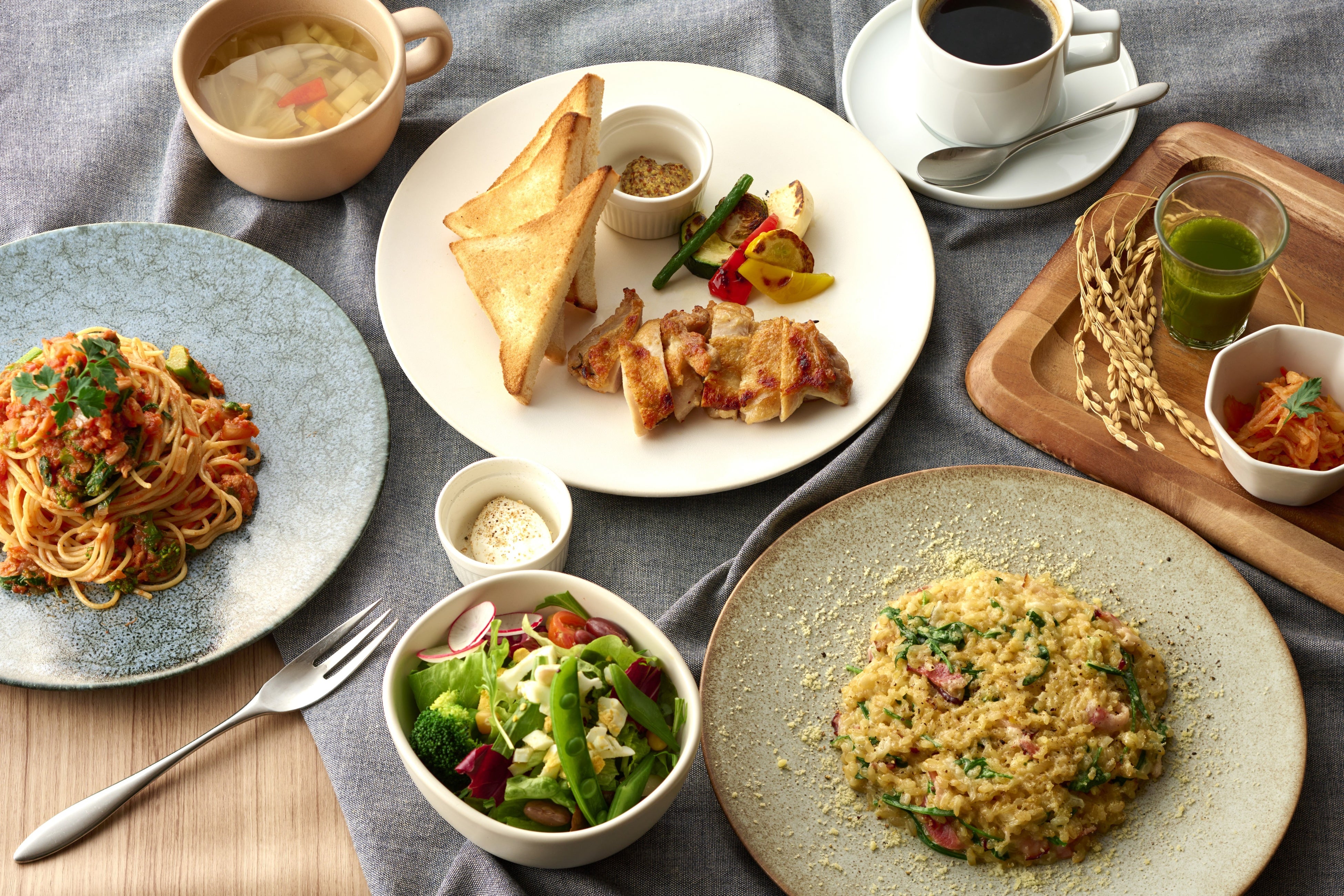 自家製の玄米パスタや、FANCL発芽米「金のいぶき」を使用したリゾットが人気メニュー。FANCLケール青汁を使用したドリンクやドレッシングなどもご提供しています。
