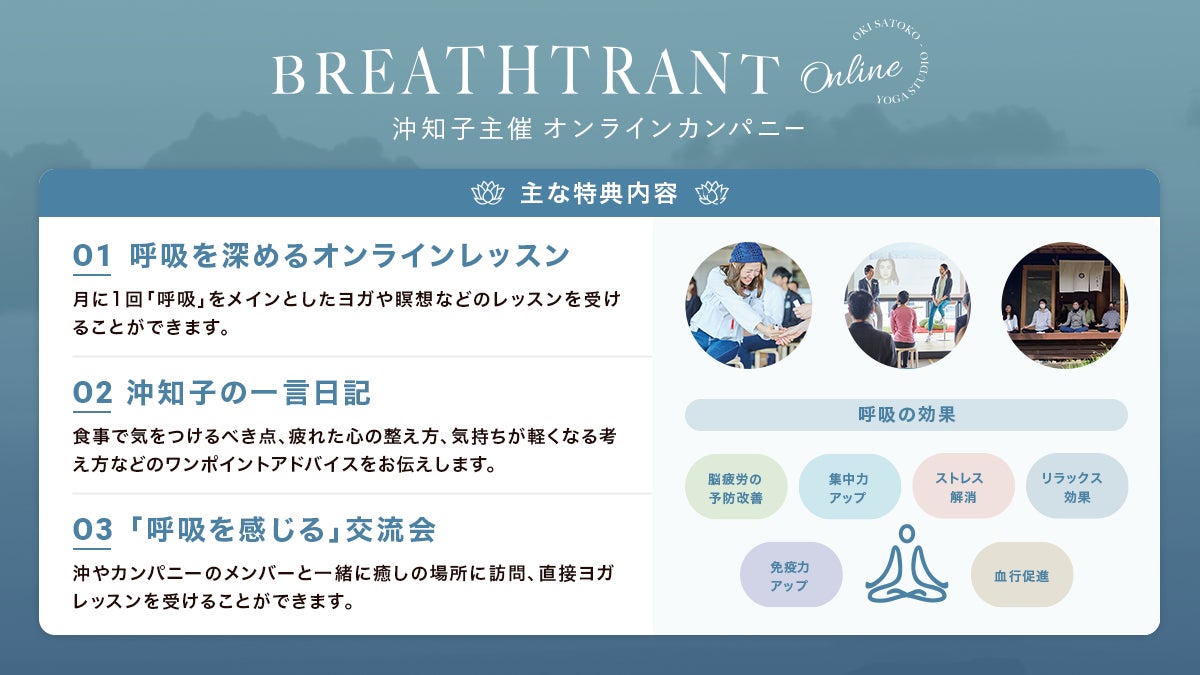 「BREATHTRANT-online-」は初代ミス・ヨガであり、大手メーカーや建設業界等様々な企業向けに健康経営サービスを展開している沖知子がオーナーを務める、ストレッチや呼吸法、瞑想といった「呼吸を味わう」術を身につけ、自分の心のケア(コンディショニング)を学べるオンラインコミュニティです。