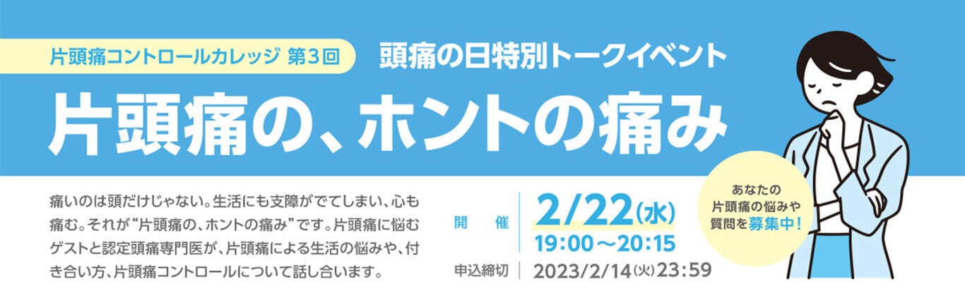 アムジェン株式会社は、一般社団法人日本頭痛学会(東京都新宿区、代表理事 竹島 多賀夫)、JPAC(頭痛医療を推進する患者と医療従事者の会、Japan Patient Advocacy Coalition)の後援のもと、より良い片頭痛コントロールを目指すオンラインセミナー「片頭痛コントロールカレッジ」の第3回として「頭痛の日特別トークイベント『片頭痛の、ホントの痛み』」を2月22日(水)頭痛の日に開催いたします。