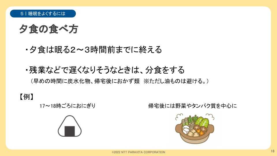 ねむりのDXカンパニーNo.1をめざすNTT PARAVITA株式会社(大阪市 代表取締役社長:中野 康司、以下「NTT PARAVITA」)は、2023年2月28日(火)と3月2日(木)に「一般向け睡眠セミナー『学校では教えてくれない睡眠の話(年度末の忙しい季節を食事と睡眠で乗り越えよう)』」を開催します。(先着100名限定)年度末は一年最後の追い込みで慌ただしい季節。仕事や送別会など様々な予定が重なることで生活リズムが乱れ、身体の不調が出やすい時期でもあります。今回のセミナーでは、働く皆さまの繁忙期を「食事」と「睡眠」で乗り切るテクニックをお伝えします。春から転勤が決まり、新生活に向けて心身の調子を整えたいという方にもおすすめです。(参加者限定特典あり)
